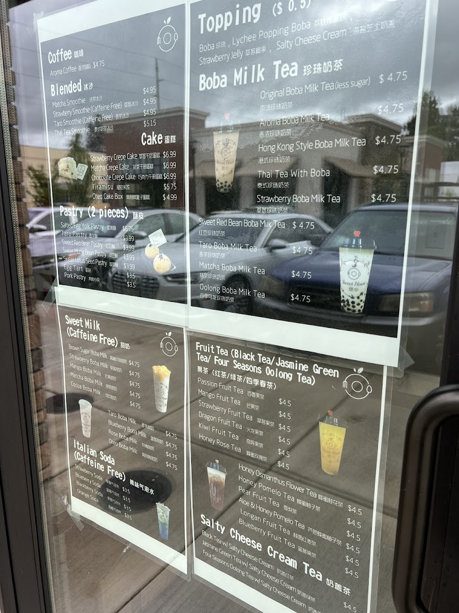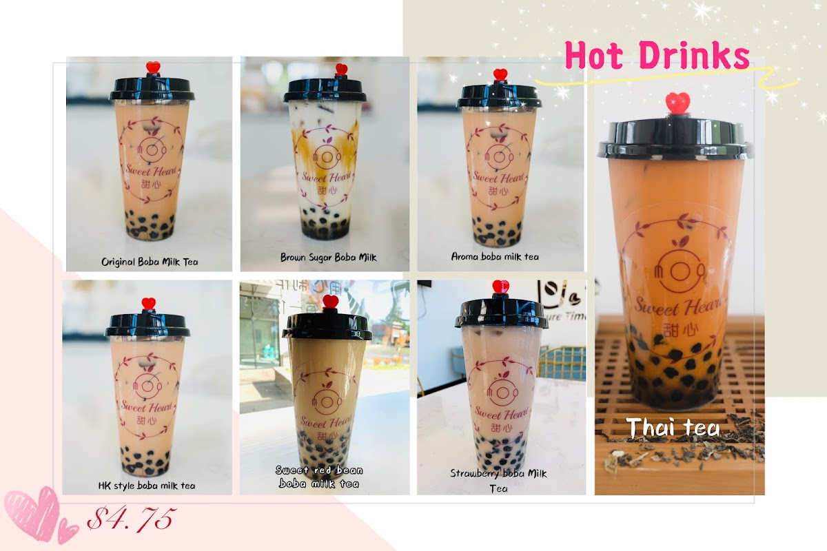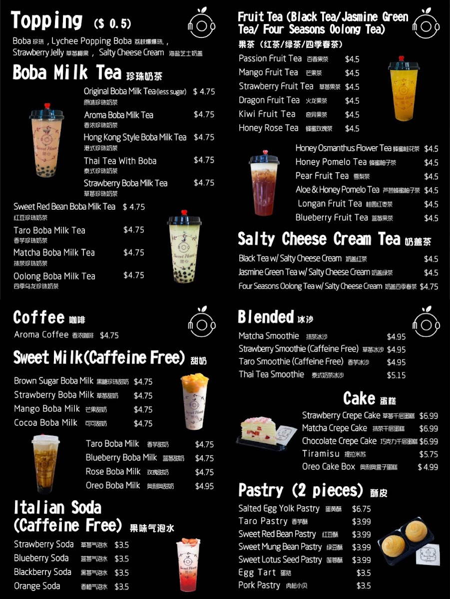 From a reviewer’s perspective, the menu at Sweet Heart 甜心 offers a pleasant variety of desserts and drinks that feel both comforting and refreshing, making it a great spot for a casual treat. The pastry selection is simple, highlighted by the Pork Pastry, while the cake menu stands out with favorites like the Original Milk Custard, Chocolate Crepe Cake, Peach Milk Custard, Mango Milk Custard, and the popular Oreo Cake Box. Their drink menu is extensive, especially the boba options such as Hong Kong Boba Milk Tea, Thai Tea With Boba, Original Boba Milk Tea, Aroma Boba Milk Tea, and Strawberry Boba Milk Tea. Fruity and refreshing choices like Kiwi Fruit Tea, Blueberry Fruit Tea, Honey Osmanthus Flower Tea, Dragon Fruit Tea, and Honey Rose Tea add more variety. For something creamy, the Strawberry Boba Milk, Mango Boba Milk, Matcha Boba Milk, Coca Boba Milk, and Taro Boba Milk are worth trying, while the Four Spring Oolong Tea Creama, Black Tea Creama, and Green Tea Creama offer a smooth finish. Overall, the menu feels well-rounded, with plenty of sweet treats and drinks to suit different tastes.